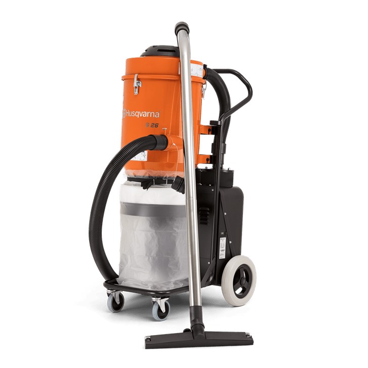 Ο S 26 είναι ένας ισχυρός μονοφασικός συλλέκτης σκόνης HEPA που ταιριάζει με τα τριβεία Husqvarna PG 280, PG 450 και το Soff-Cut 150.